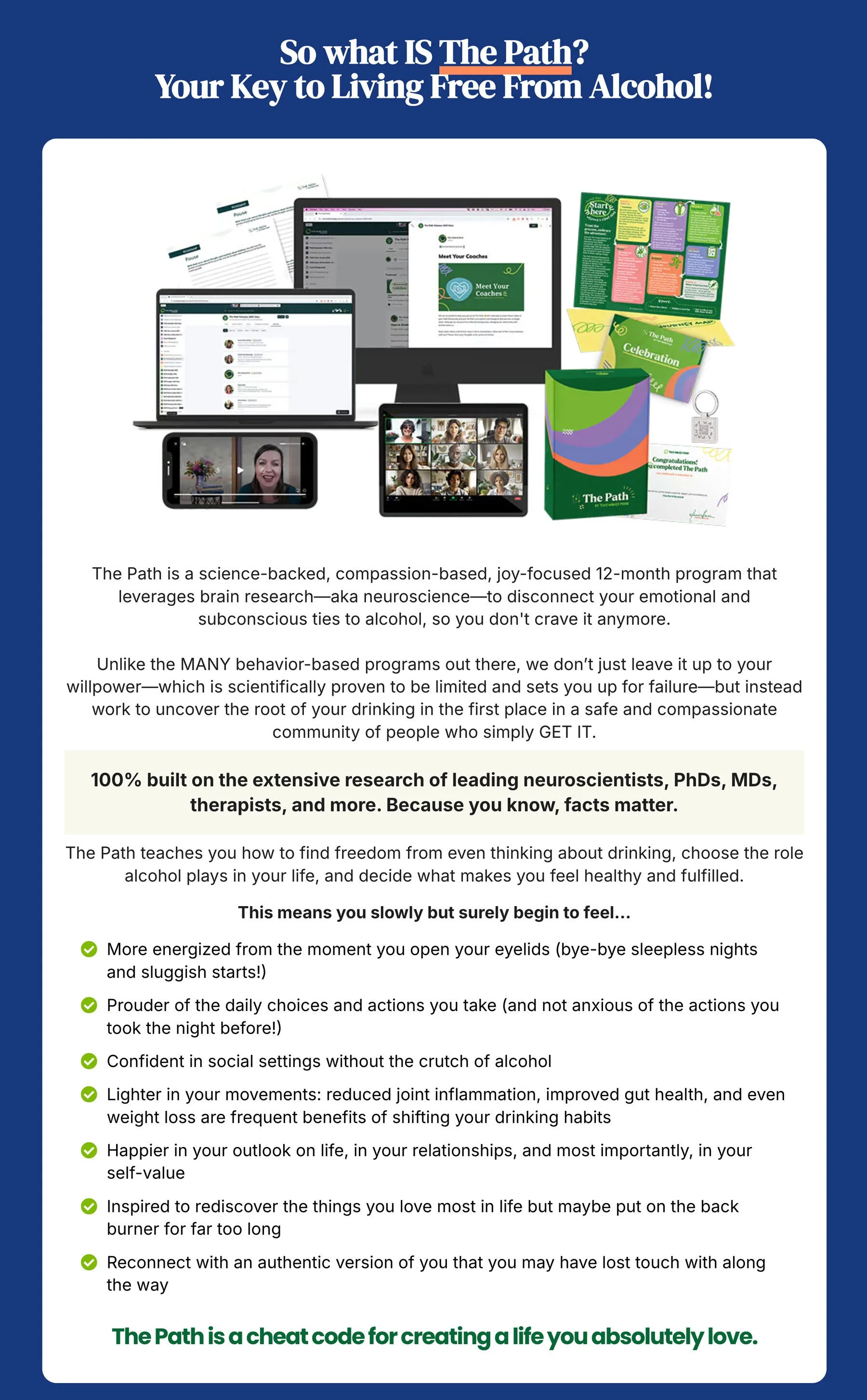 Traditional free programs often focus only on behavior, relying on willpower alone to resist drinking. We are open to supporting any program(s) that successfully empowers individuals to find true freedom from alcohol. The founder, Kelly, gained this freedom via The Path, through This Naked Mind. This paid program goes beyond behavior to uncover and change limiting beliefs about alcohol through compassion, science-backed evidence, and empowerment—making true freedom not only possible but easy.